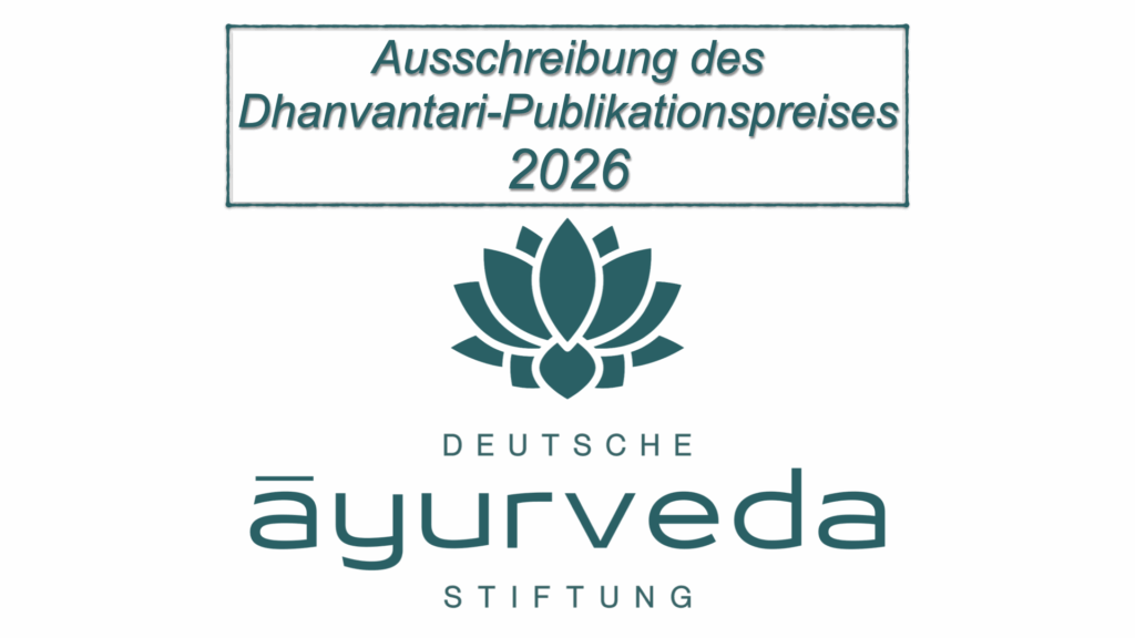 Die Deutsche Ayurveda-Stiftung lobt auch 2026 wieder den Dhanvantari-Publikationspreis für wissenschaftliche Veröffentlichungen im Bereich Ayurveda aus.Mit diesem Publikationspreis möchte die Deutsche Ayurveda-Stiftung innovative wissenschaftliche Arbeiten auf diesem Gebiet aus dem Jahr 2024 auszeichnen. Eingereicht werden können im Jahr 2025 veröffentlichte Arbeiten zu Ayurveda, die von Arbeitsgruppen oder Einzelpersonen an deutschen Hochschulen publiziert wurden. Die Ausschreibung … Continued